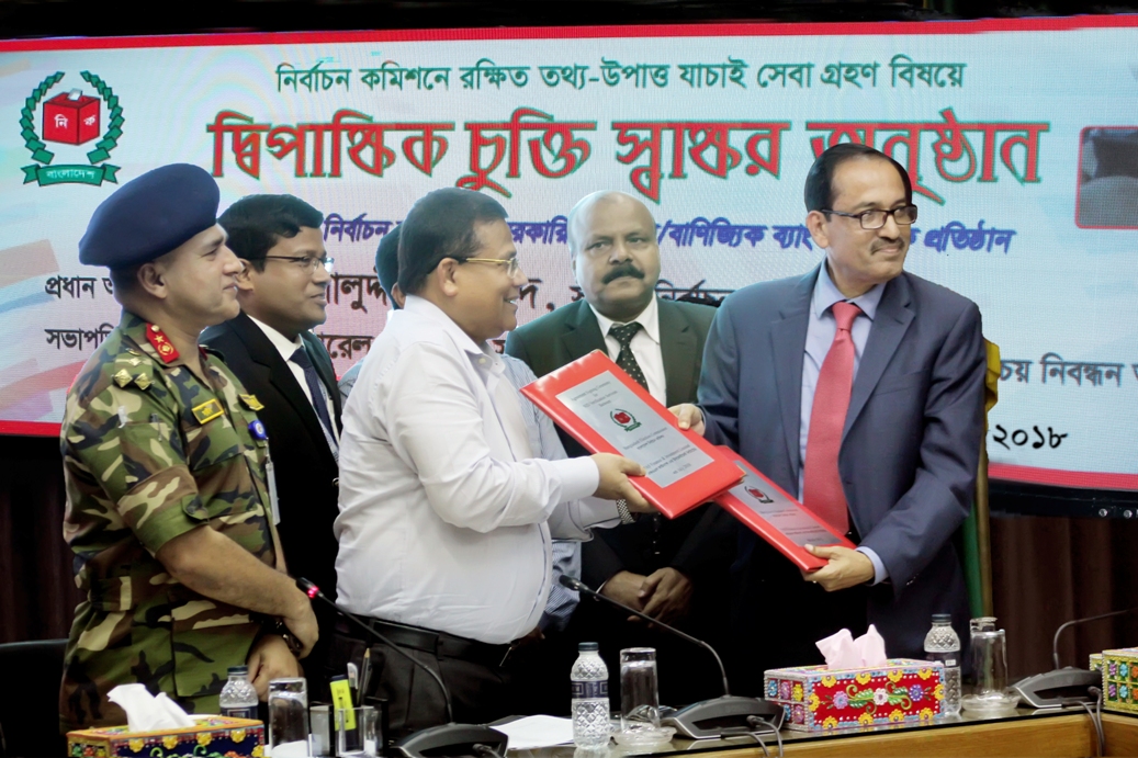 Joint Secretary & Director (Operations), NID Registration Cell Md. Abdul Baten and Managing Director & CEO of FAS Finance & Investment Ltd. Pritish Kumar Sarker exchanging documents after signing an agreement on behalf of their respective organisations recently to verify NID. For Details